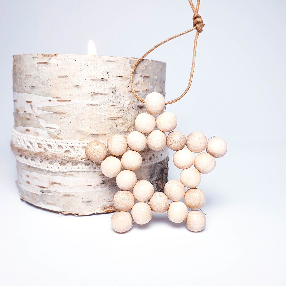 Jednotlivé korálky jsou ze světlého dřeva a jsou leštěné. Hvězdička je opatřena poutkem z voskované šňůry, které můžete v případě potřeby jednoduše odejmout.