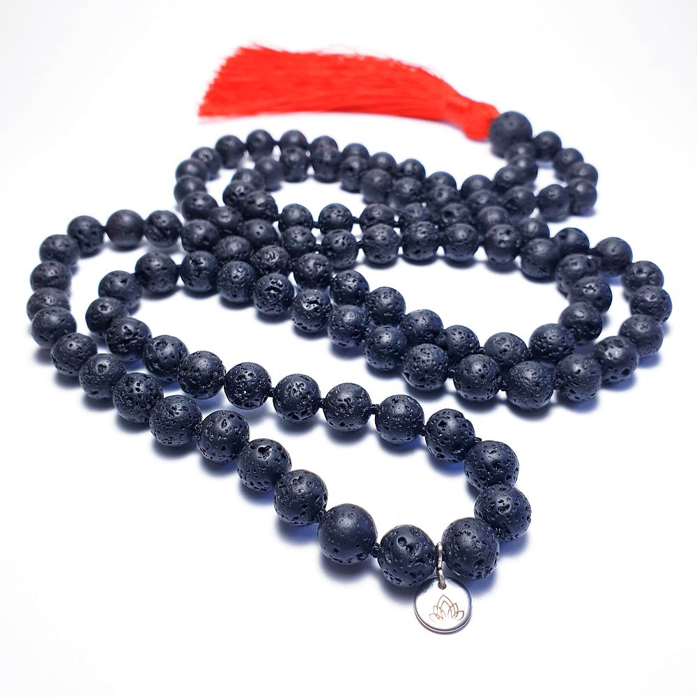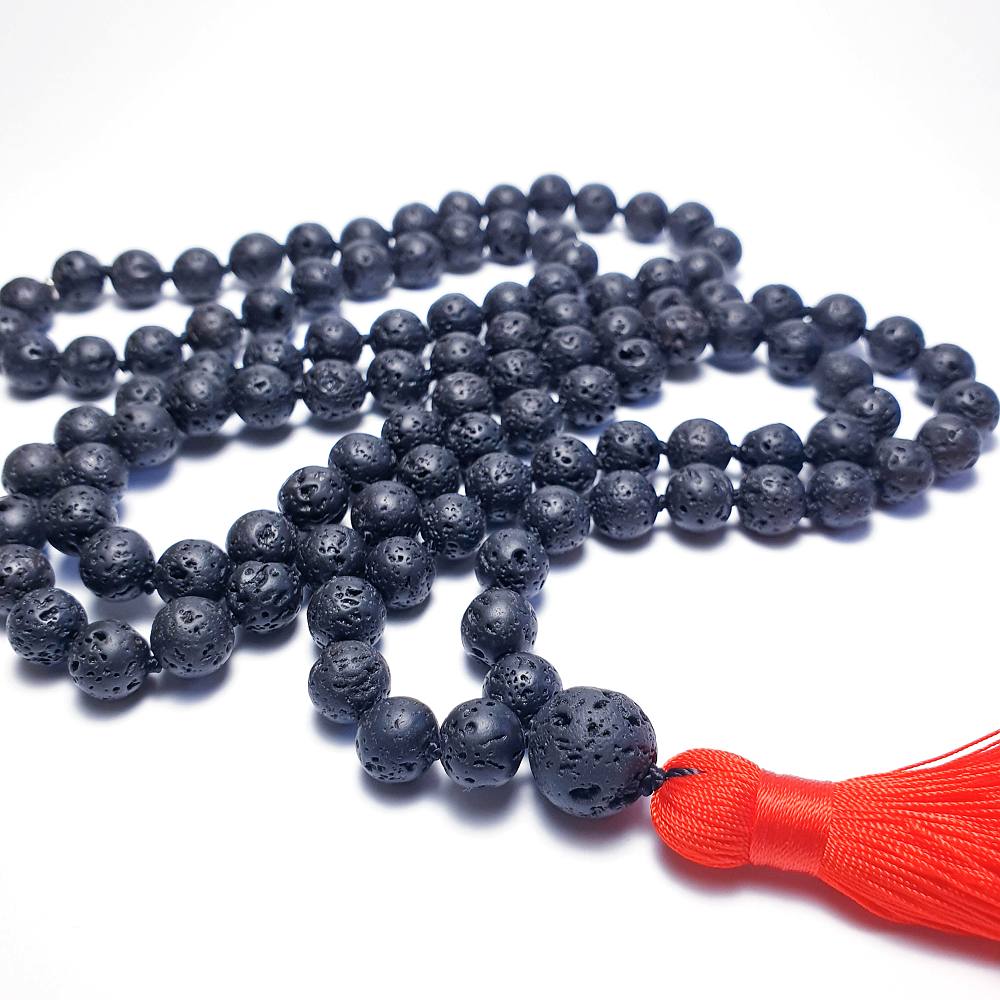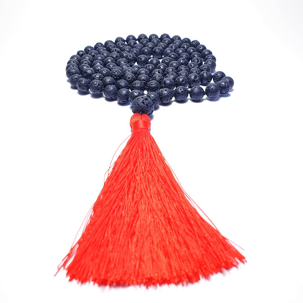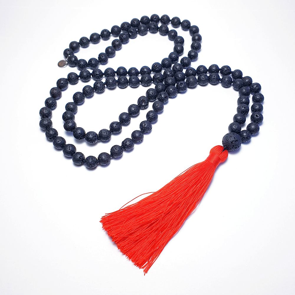 Červeno černá Japa Mala z lávového kamene. Mala je sestavena ze 108 korálků, guru korálku a střapce.