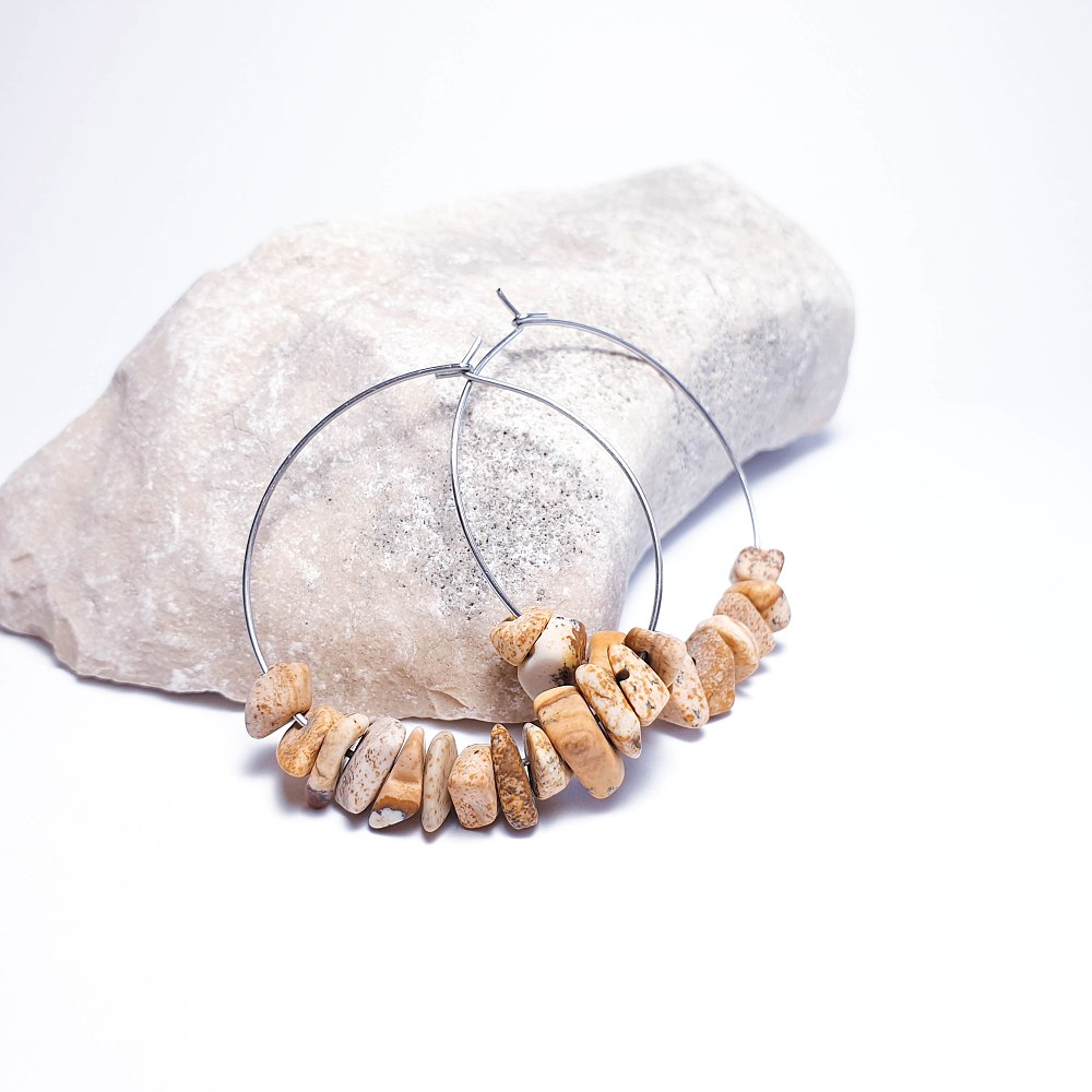 Jednoduché kruhové náušnice z nerezové oceli s pravými minerály. Každý kus je originál díky ruční výrobě a přírodním kamenům.