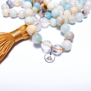 Originální náhrdelník Rudraksha Japa Mala se 108 korálky + 1 křišťálový guru korálek a střapec.