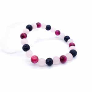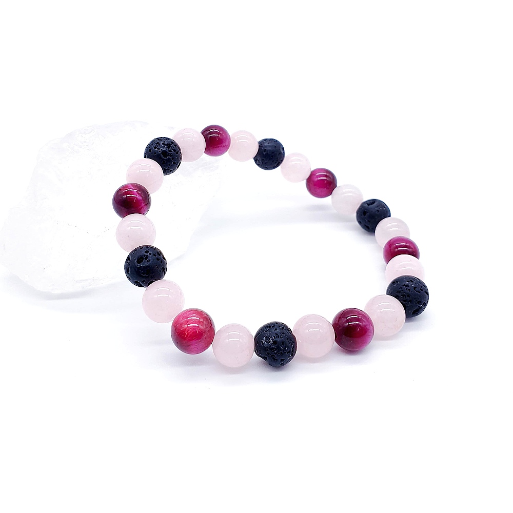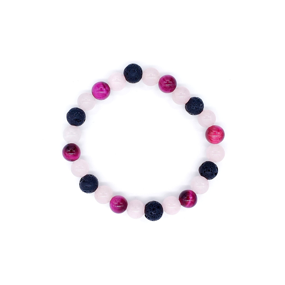 Růženín, lávový kámen, tygří oko magenta 8 mm – náramek