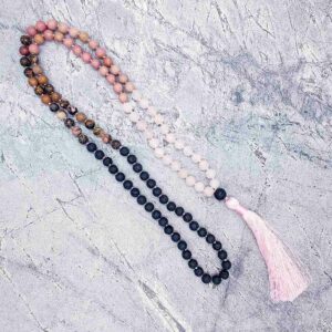 Mala je sestavena ze 108 korálků, guru korálku a střapce.