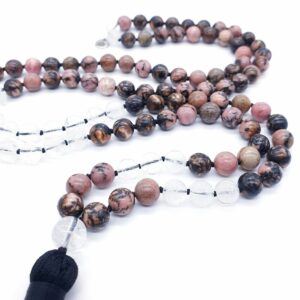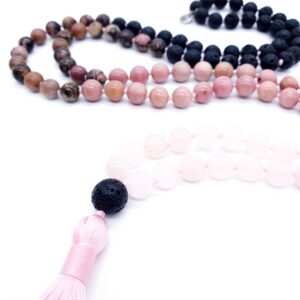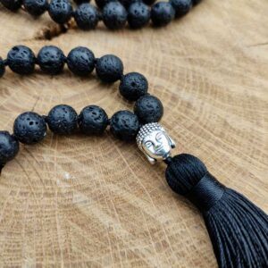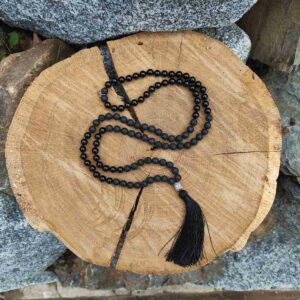 Luxusní černá Minerální Japa Mala z lávy a turmalínu. Mala je sestavena ze 108 korálků, guru korálku a střapce.