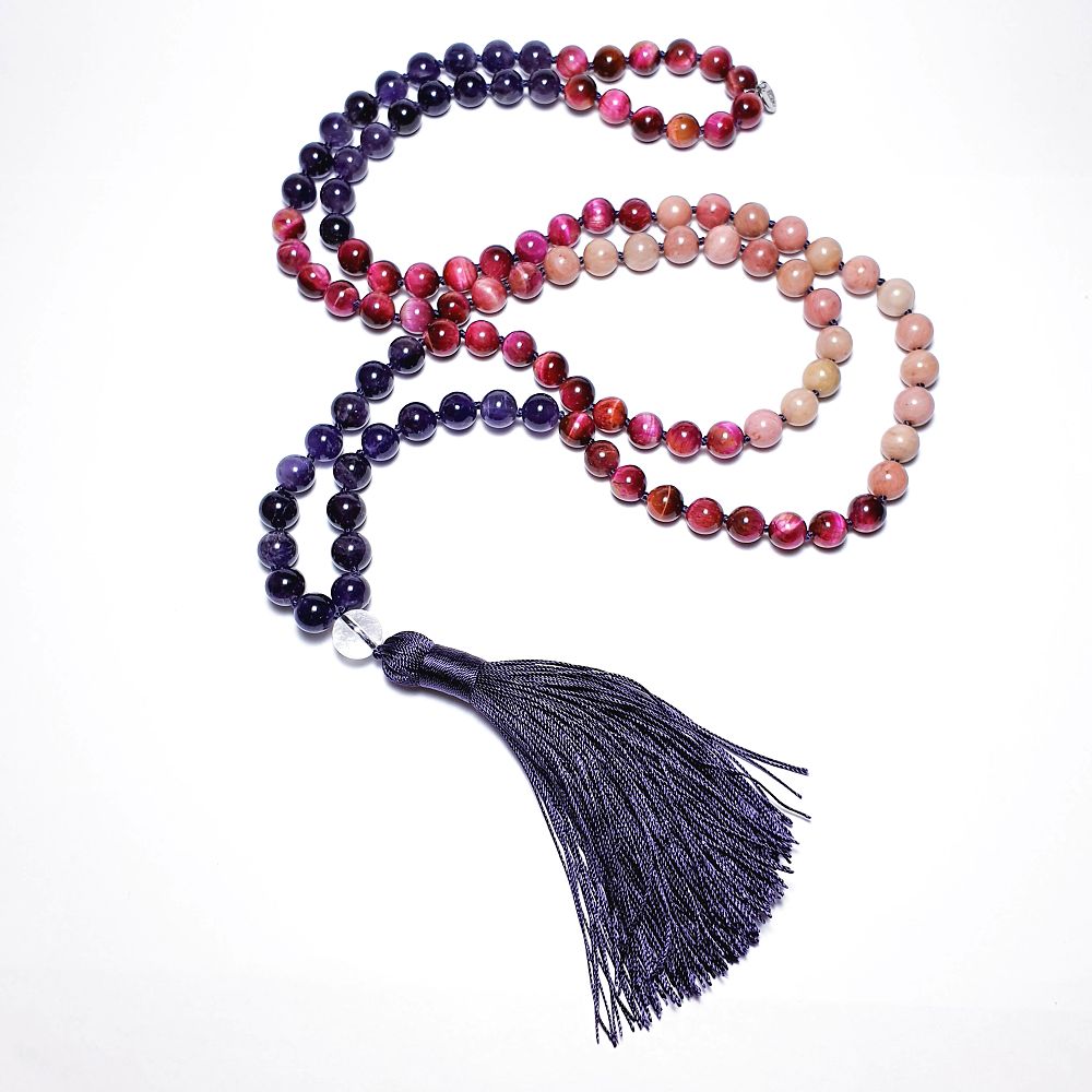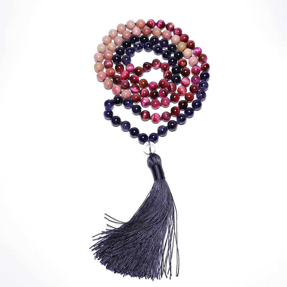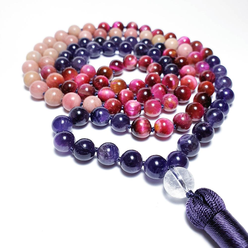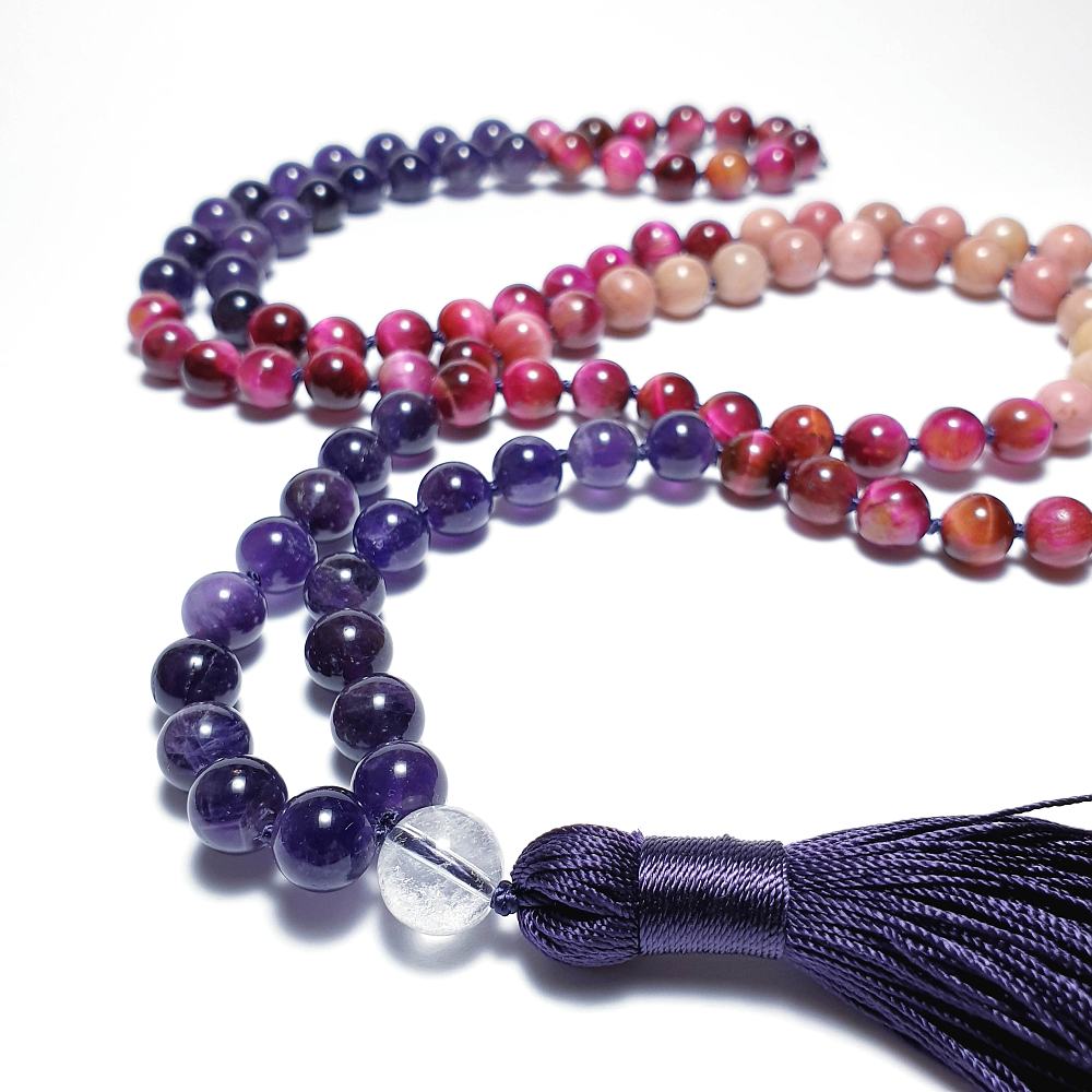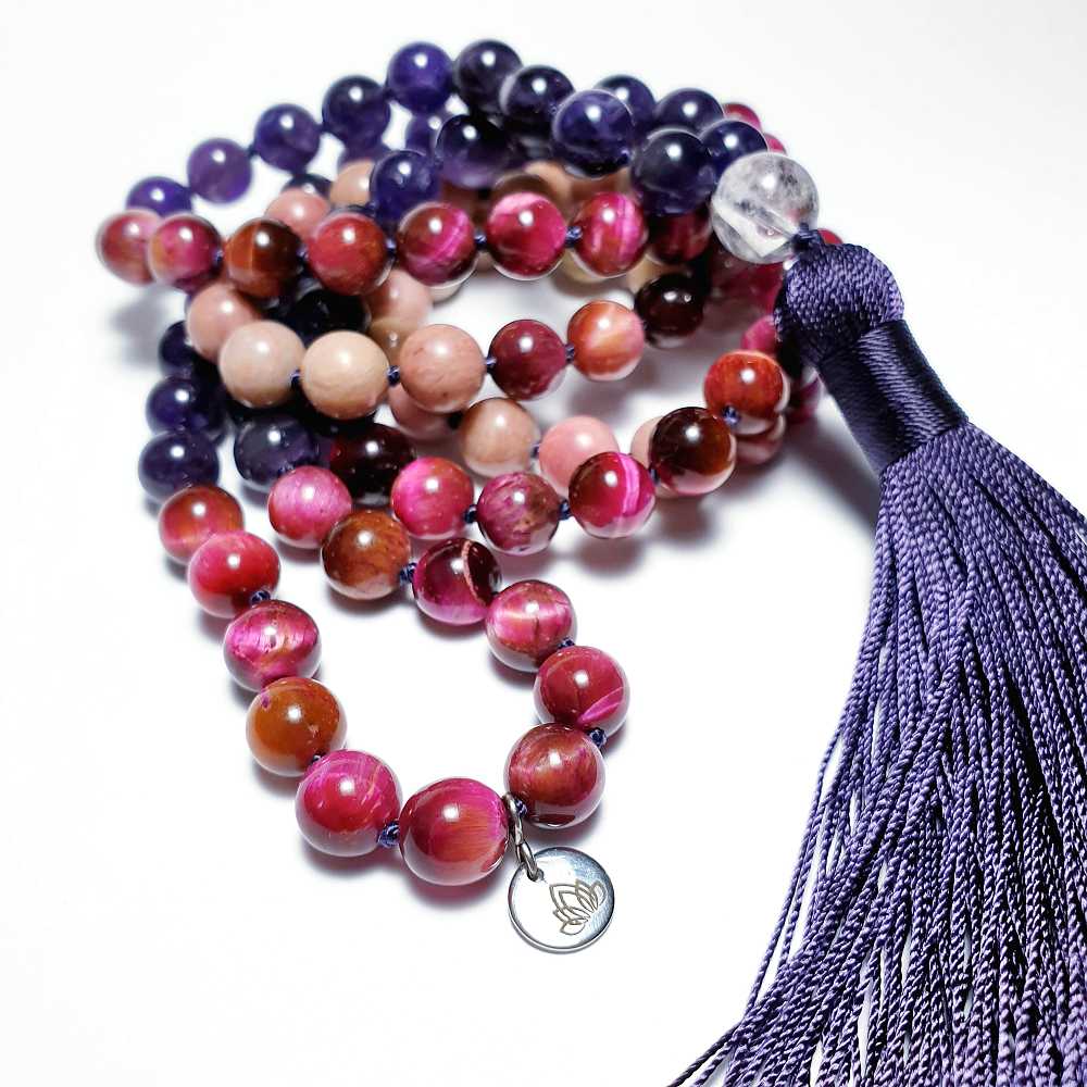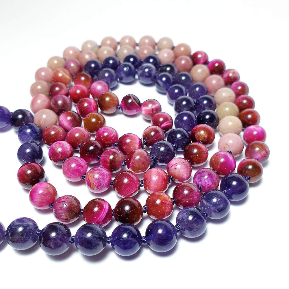 Tygří oko magenta, ametyst, rodonit, křišťál – Japa Mála náhrdelník