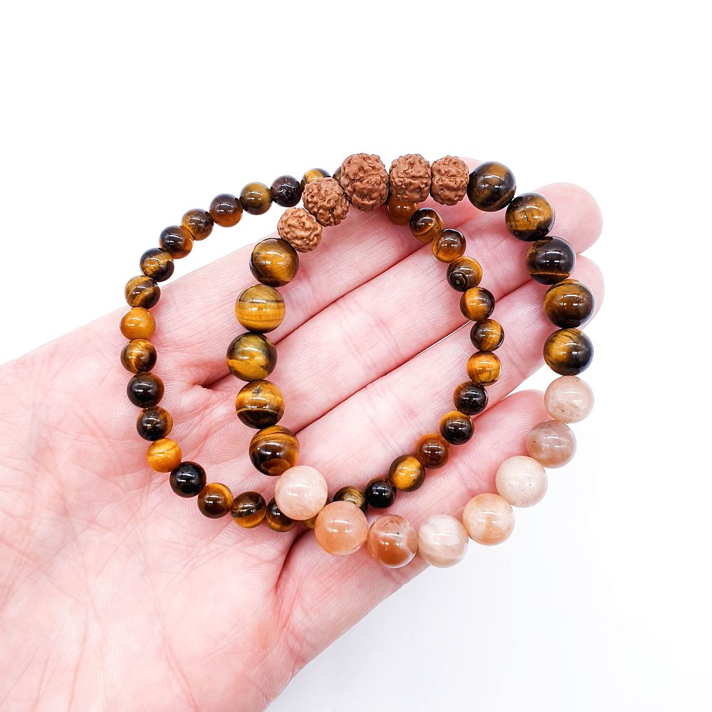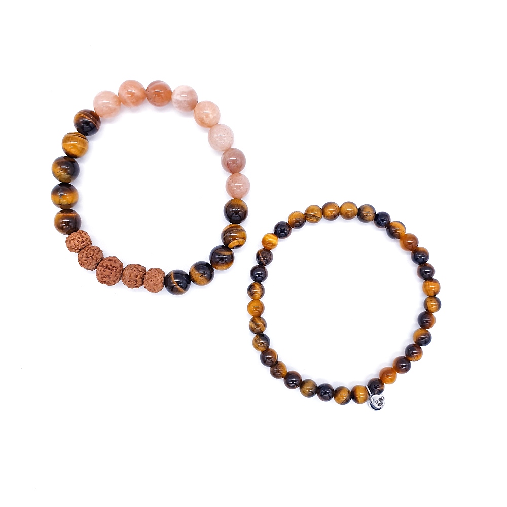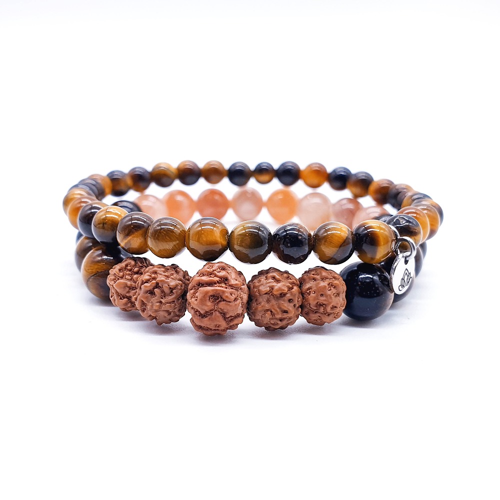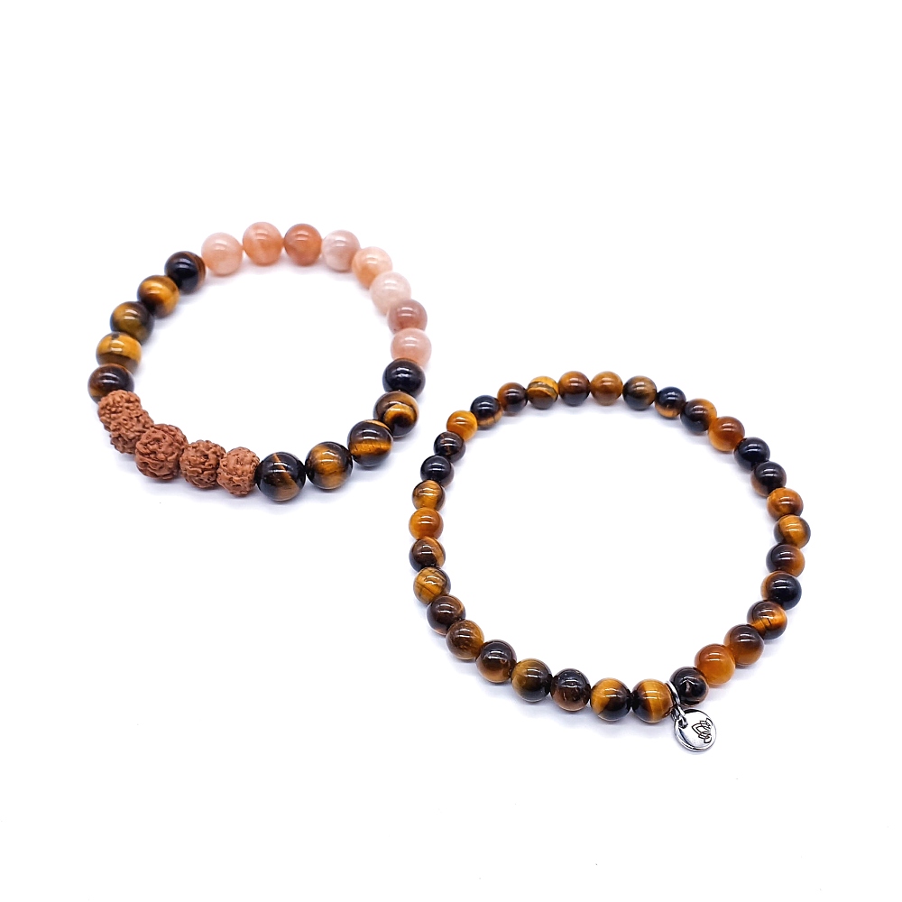 Tygří oko, sluneční kámen, rudraksha – 2 ks náramků